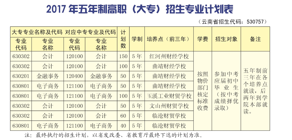 云南财经职业学院2017年五年制高职(大专)招生计划表(云南省招生代码:530757)
