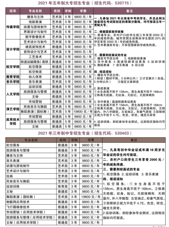 昆艺2021年五年制大专、三年制中专招生简章