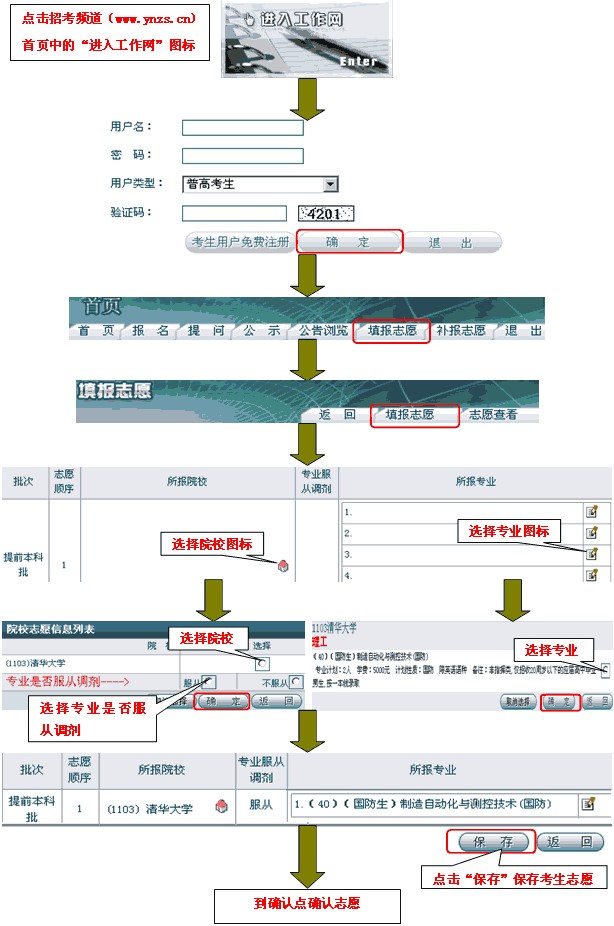 在填报截止时间之前,考生登录工作网(www.ynzs.cn或www.ynzk.cn),自行进行志愿填报;在确认截止时间之前,考生携带准考证到确认点进行确认、签字,完成志愿填报。