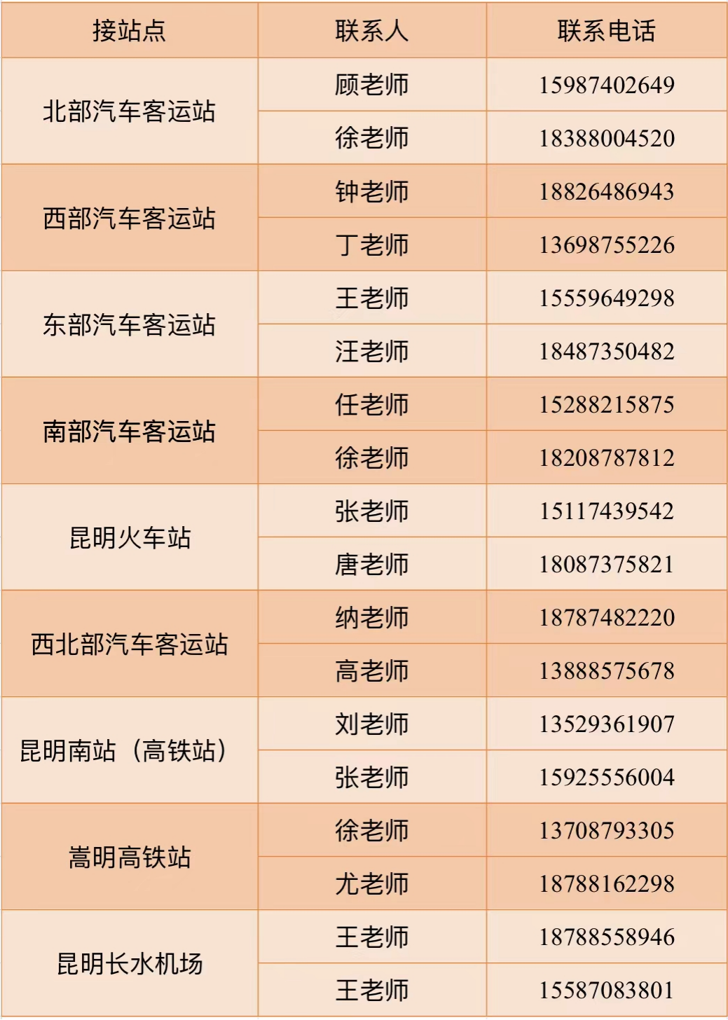 车站新生接待联系人开学报到期间,学校在昆明长水机场、昆明火车站等各车站都设有新生接站点,同学们达到各车站后联系接站老师,坐上学校大巴就直达学校啦。各车站接站老师联系方式如下👇👇👇