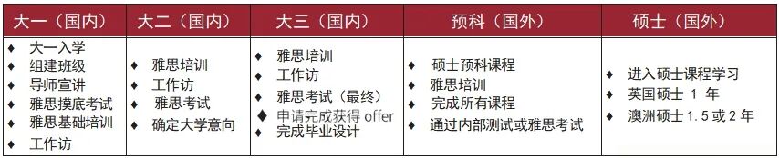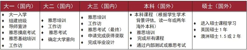 在国内大专期间,通过采用小班式教学,系统学习雅思课程,以优秀师资阵容、全程导师服务为优势,以国际性活动、公益活动及学科竞赛为亮点,量身定制个性化培养方案,全面提升学生英语应用能力、专业理论知识及综合素质水平,为顺利进入海外名校夯实基础。
