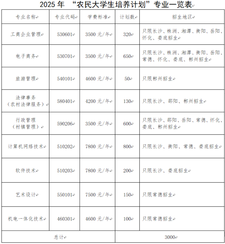 第十三条我校2025年“农民大学生培养计划”全日制高职教育专科招生总计划数为3000人,招生专业共 9个。专业计划及学费标准如下表,各专业最终学费标准以2025年湖南省物价主管部门审核为准。