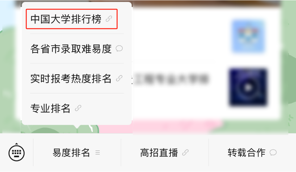 想要了解更多学校的录取难度排名,进入易度排名公众号,点击菜单栏【易度排名】-【中国大学排行榜】。
