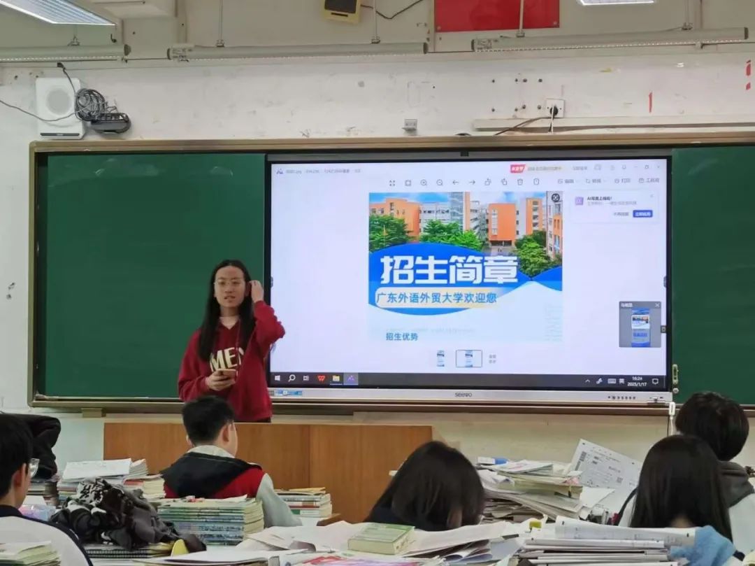在班级里进行宣讲的时间虽短,但我们早有准备:一张精心制作的简明海报,迅速勾勒出广外的亮点与特色,让学弟学妹们在短时间内对广外有了初步的了解,问答互动环节更是将气氛推向高潮,学弟学妹们积极提问,成员们耐心解答,一场生动的招生宣讲在教室里热烈展开。
