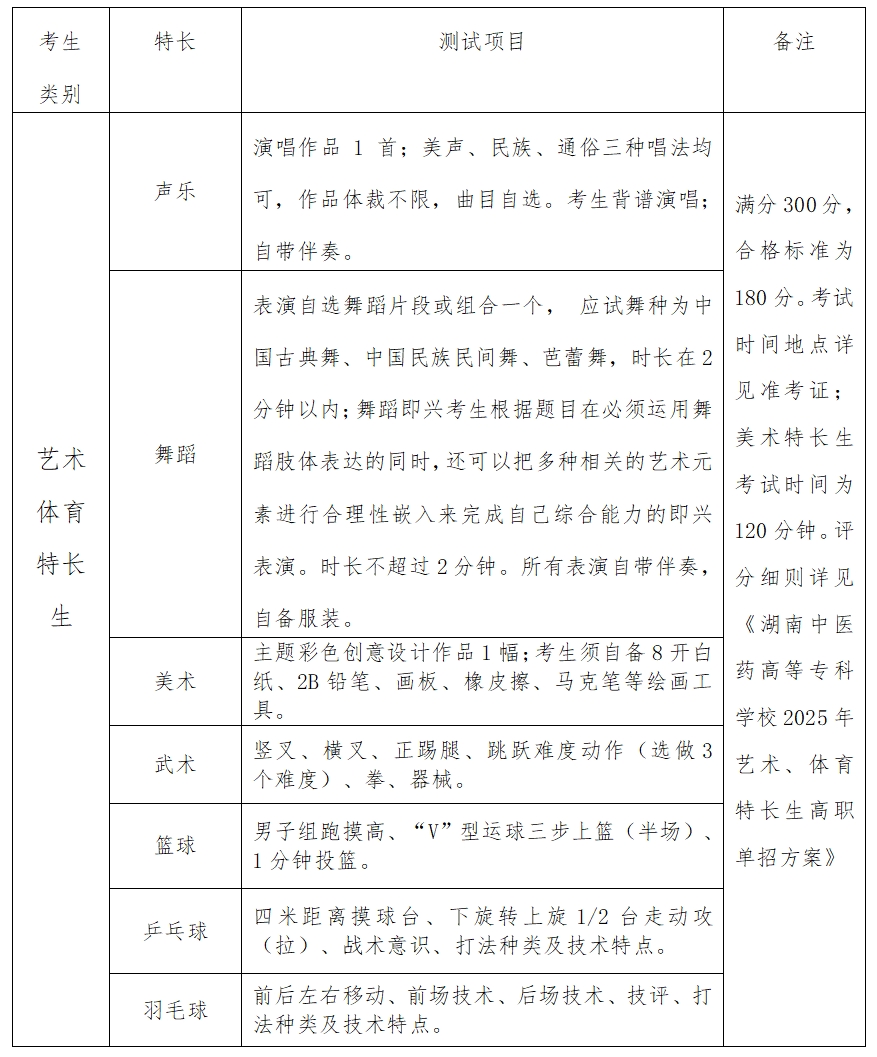 艺术特长生(声乐、舞蹈、美术)、体育特长生(武术、篮球、乒乓球、羽毛球),总分300分。