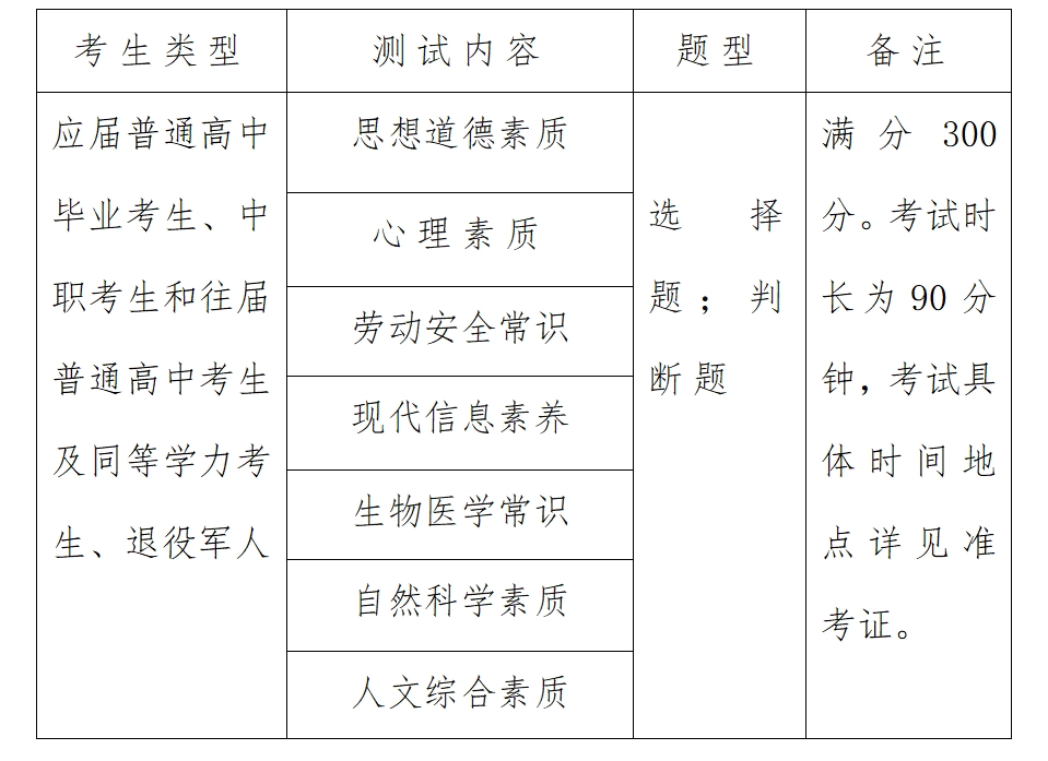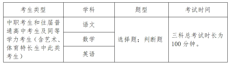 应届普通高中毕业考生、中职考生和往届普通高中考生及同等学力考生、退役军人考生,总分300分。
