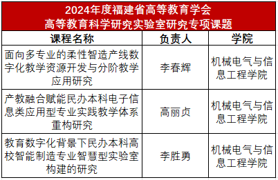 在2024年度福建省高等教育学会高等教育科学研究实验室研究专项课题立项中,我校机械电气与信息工程学院多位老师申报的课题获批立项。具体内容如下: