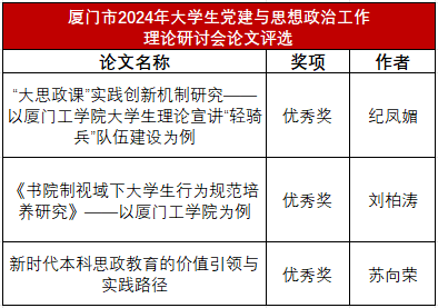 在厦门市2024年大学生党建与思想政治工作理论研讨会论文评选中,我校多位老师的论文荣获优秀奖。具体内容如下: