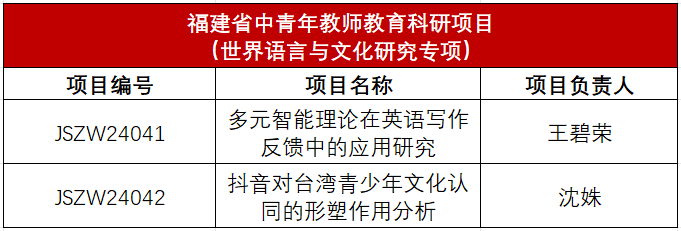 在福建省中青年教师教育科研项目(世界语言与文化研究专项)、福建省中青年教师教育科研项目(社科类)、福建省中青年教师教育科研项目(科技类)中,我校多位老师申报的项目获批立项。具体内容如下:
