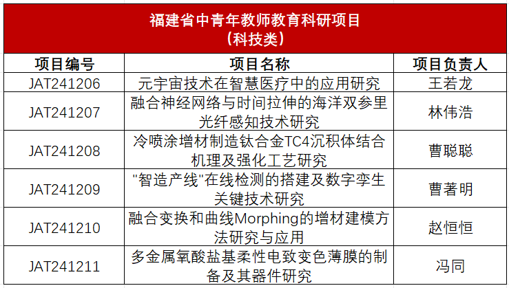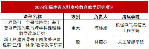 在2024年福建省本科高校教育教学研究项目中,我校机械电气与信息工程学院、人工智能学院两位老师申报的课题获批立项。具体内容如下: