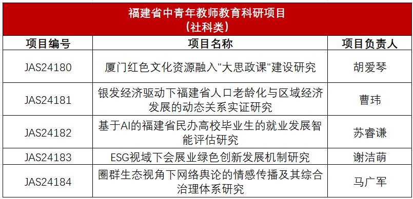 在2024年厦门市高校大学思想政治工作项目中,由李文副校长任项目负责人的《探索“社区思政+”育人模式,构建“一站式”学生社区文化建设新生态》,纪凤媚老师任项目负责人的《大学生理论宣讲轻骑兵融入“一站式”学生社区思政育人建设的路径探索》入选。