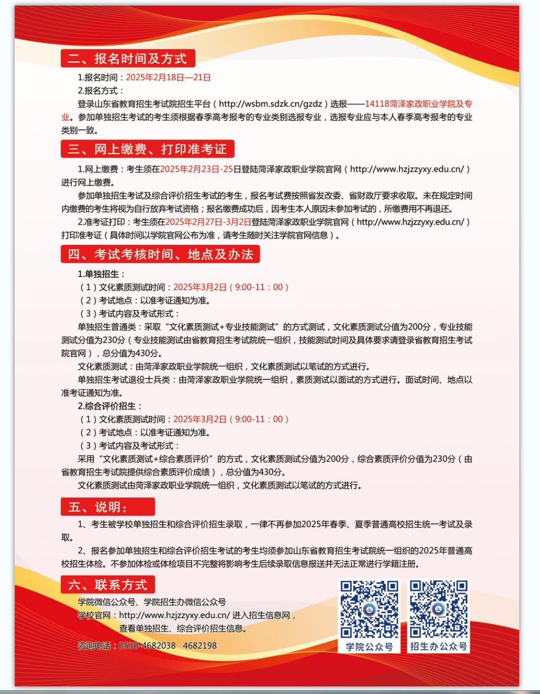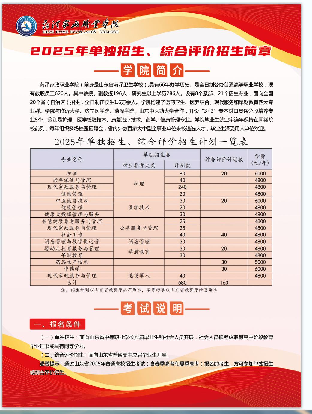 菏泽家政职业学院2025年单独招生、综合评价招生简章