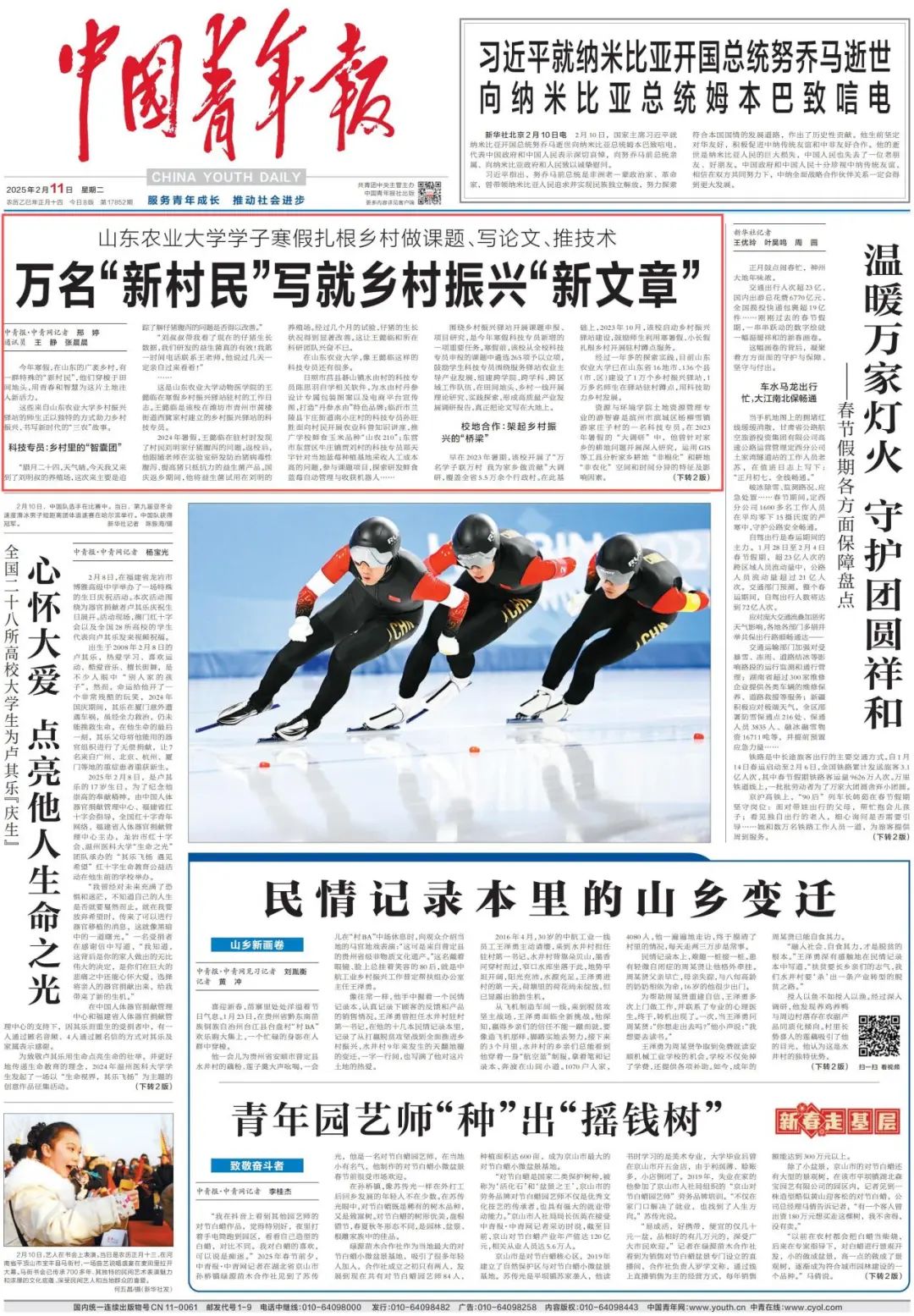 2月11日,《中国青年报》头版头条刊发题为《万名“新村民”写就乡村振兴“新文章”》的文章,详细报道了今年寒假我校师生奔赴在全省各地建设的乡村振兴驿站,用科技助力乡村发展的生动实践。报道指出,山东农业大学师生作为齐鲁乡村特殊的“新村民”,正穿梭于田间地头,用青春和智慧为这片土地注入新活力。学生科技专员围绕服务驿站农业主导产业发展,组团队、立课题、广调研、写报告,真正把论文写在大地上。通过校地合作,青年学子与家乡之间搭建起桥梁,彼此之间联系更加紧密,也让课堂学习的专业知识真正走进生产实践、走向乡村田野。学校也积极为乡村振兴驿站建设争取地方政府支持,协同多方力量为驿站做好政策支持和保障。乡村振兴驿站不仅是科技服务的前沿阵地,更是学校育人的主战场,青年学生成长的“练兵场”。师生们用知识和汗水浇灌着乡村的希望,用实际行动诠释着新时代青年的责任与担当,用这种独特的方式助力乡村振兴,书写新时代的“三农”故事。