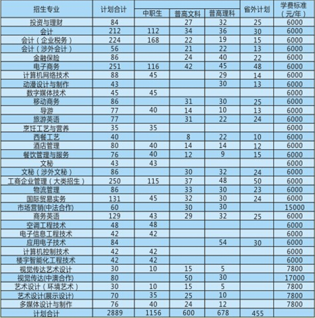 2014年学校招生计划为3302名,其中浙江普高文科471名,理科616名,艺术类文理科191名,中职单考单招1156名,省外文理科455名,自主招生413名。面向浙江省招生计划见附件1。
