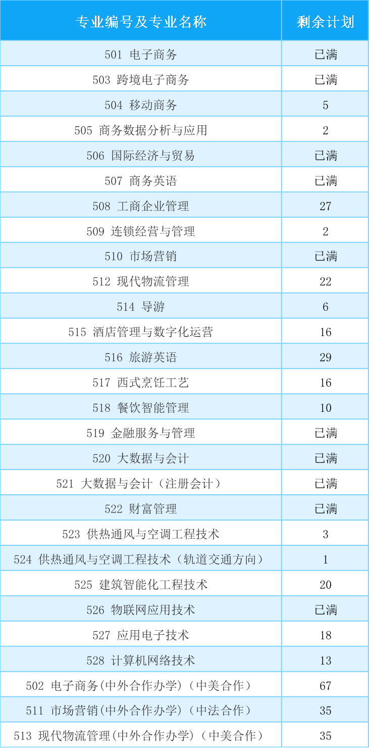 浙江省普通类一段线投档录取中,我校电子商务、大数据与会计等十个专业已完成录取,另外,供热通风与空调工程技术、移动商务、连锁经营与管理等专业剩余计划寥寥无几;其他专业也在一段线中有一定数量的录取。剩余计划见下表: