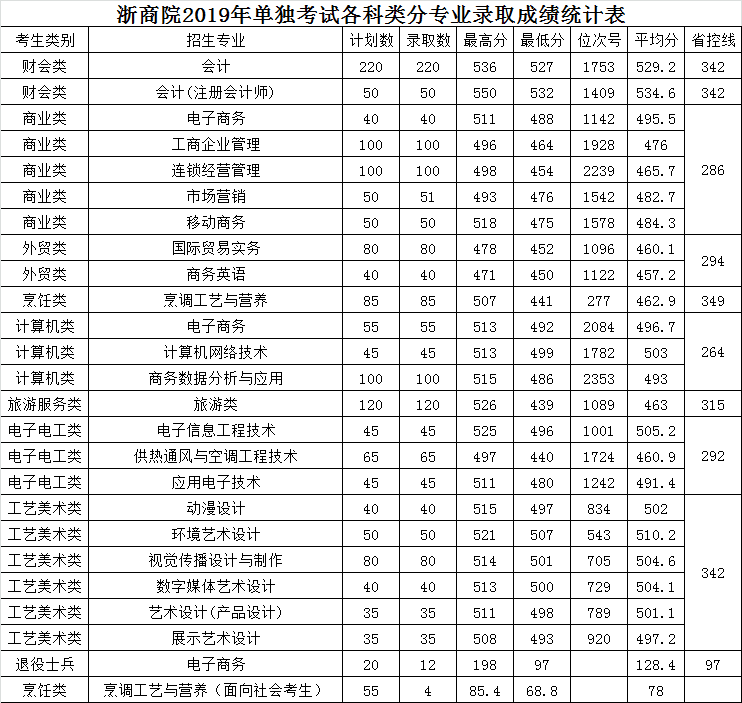 浙商院2019年单独考试各科类分专业录取成绩统计表