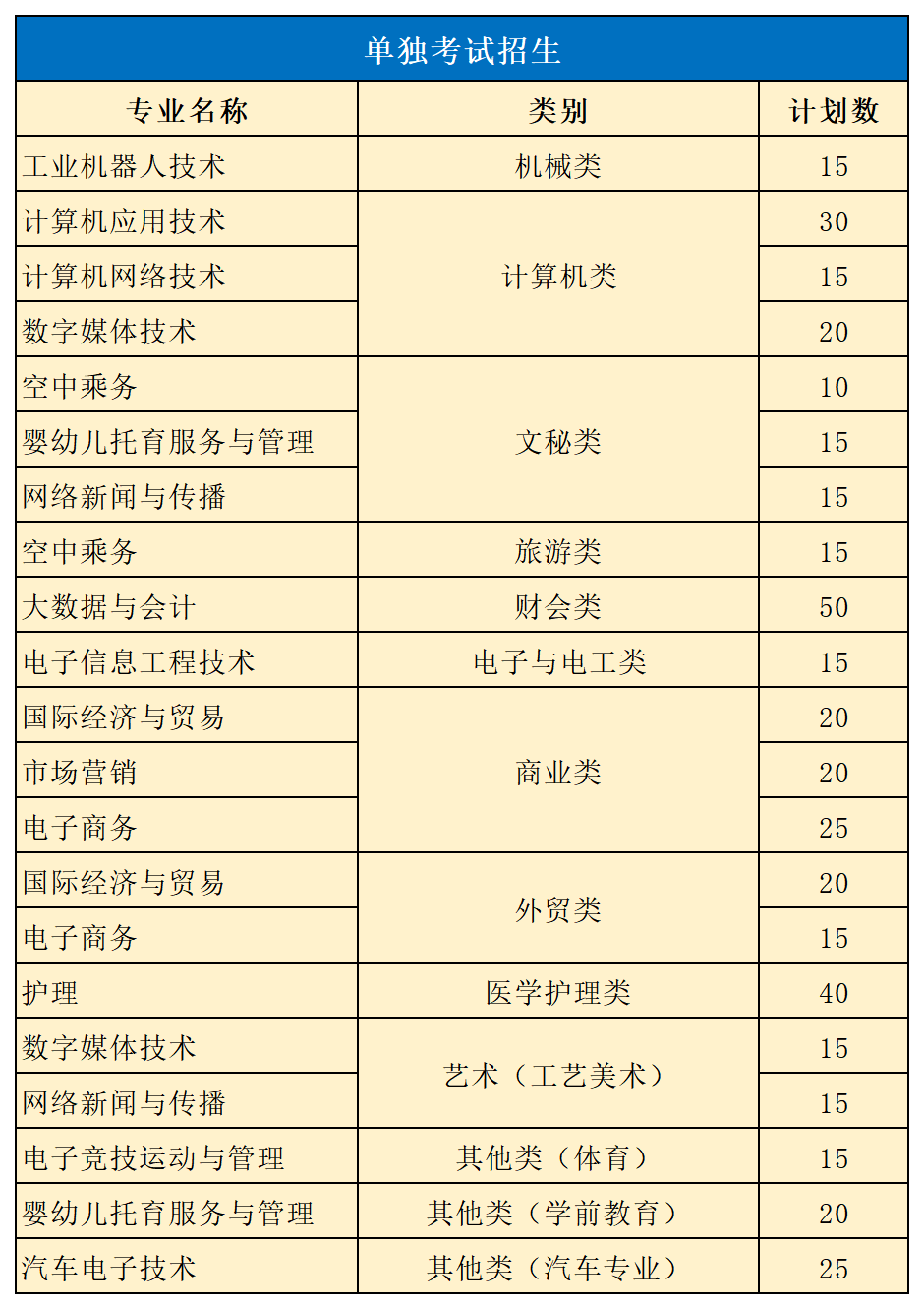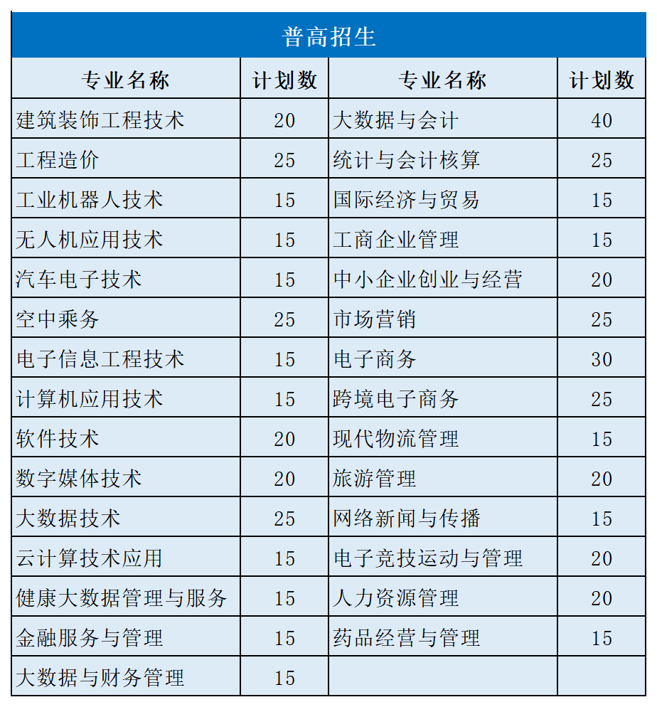招生专业32个,招生计划1000名。其中面向普高招生考生计划570名,面向单独考试招生考生计划430名,学制均为三年,具体专业计划如下表: