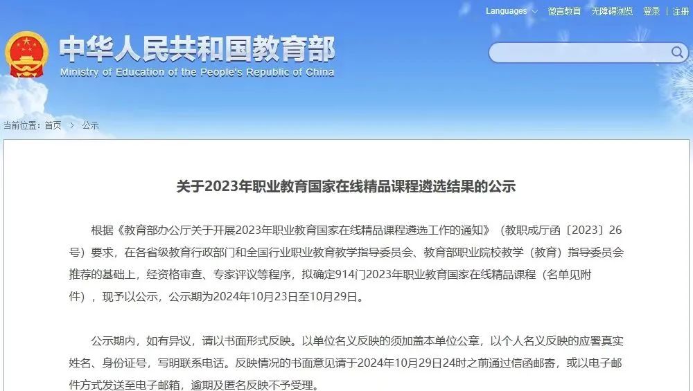 10月23日,教育部发布“关于2023年职业教育国家在线精品课程遴选结果的公示”,根据《教育部办公厅关于开展2023年职业教育国家在线精品课程遴选工作的通知》(教职成厅函〔2023〕26号)要求,在各省级教育行政部门和全国行业职业教育教学指导委员会、教育部职业院校教学(教育)指导委员会推荐的基础上,经资格审查、专家评议等程序,拟确定914门2023年职业教育国家在线精品课程。