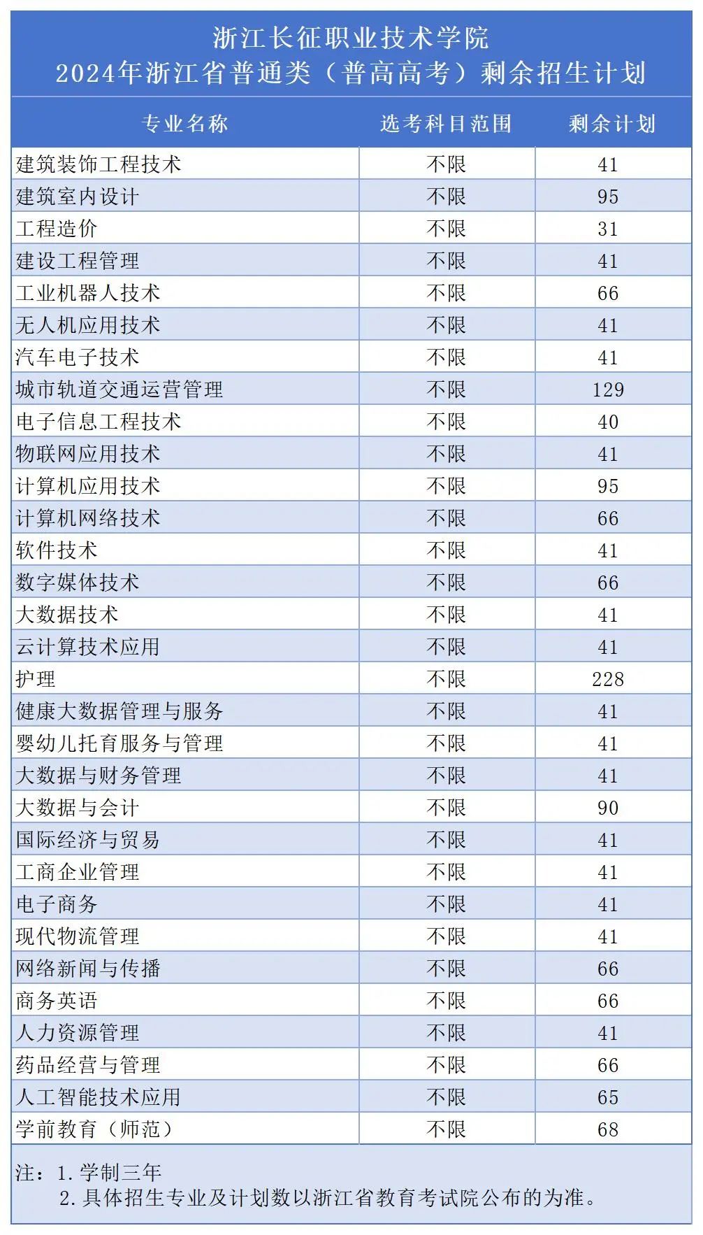 浙江长征职业技术学院所有招生专业都不设选考科目要求,二段线以上尚未录取的每一位考生都有资格填报长征31个专业志愿。