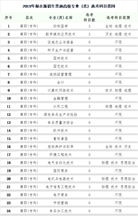 温州科技职业学院2019年拟在浙招生普通高校专业(类)选考科目范围