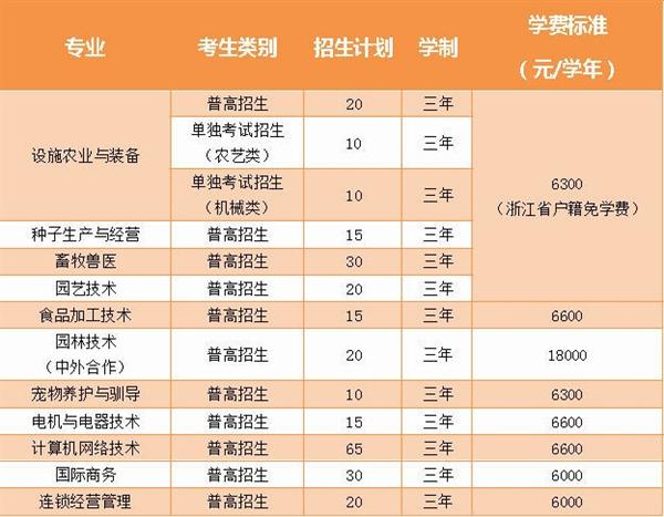 1、学费:6000-7200元/学年·人。其中录取并就读设施农业与装备、种子生产与经营、绿色食品生产与检验、园艺技术、畜牧兽医专业的学生,按浙教计[2006]124号文件,浙江省户籍学生免交学费,所需经费由省财政负担;园林专业(中外合作)学费为18000元/学年。