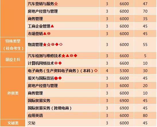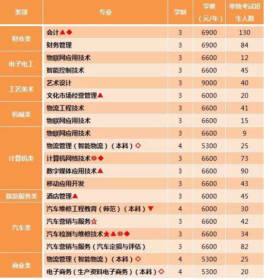 注:1.专业建设类型“●”为中央财政支持专业服务发展能力建设项目,“★”为国家骨干校建设专业,“■”为高等职业教育专业教学资源库建设项目,“▲”为省特色建设专业,“☆”为省重点专业,“◎”为省示范建设专业,“◆”为省优势建设专业,“○”为省现代学徒制试点专业。2.“◇”为浙江省四年制高等职业教育人才培养试点专业,系我校与浙江工商大学联办,颁发浙江工商大学全日制普通本科毕业证书、学士学位。“▼” 系我校与浙江师范大学联办,颁发浙江师范大学全日制普通本科毕业证书、学士学位。3.招收技能优秀中职毕业生免试生计划另设。 4.具体计划以教育部、各省教育考试院公布数字为准。