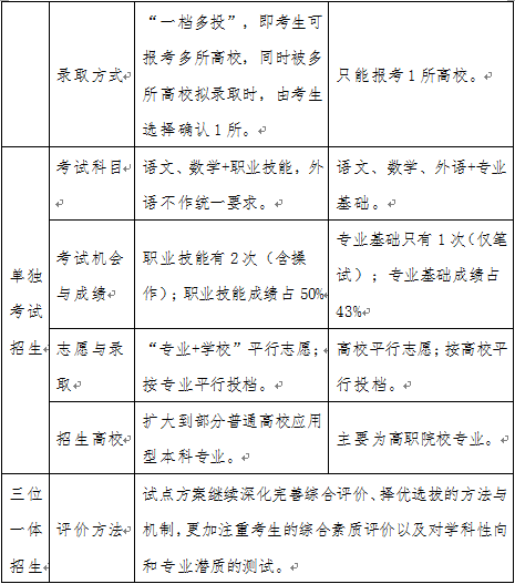 二是推进综合评价选拔。统一高考招生实行高考与学考、必考与选考相结合,高职提前招生实行高中学考或职业技能与综合素质相结合,单独考试招生实行文化素质与职业技能相结合,三位一体招生实行统一高考、高中学考和综合素质评价相结合。四类考试招生模式均强调评价选拔的综合性,推进人才评价选拔从单一向综合转变。