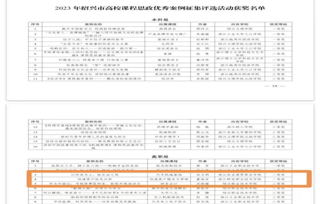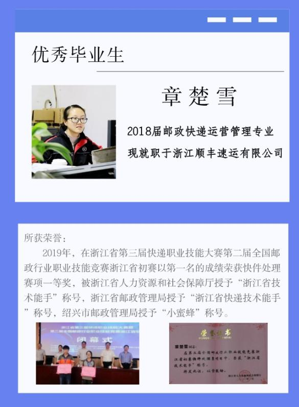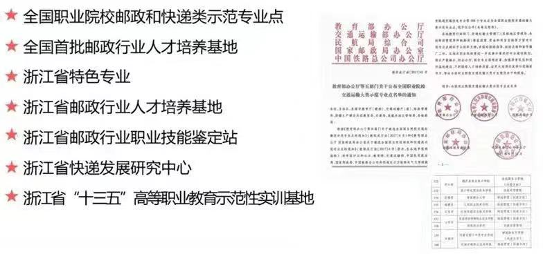 专业荣誉:全国职业院校邮政和快递类示范专业点、全国首批邮政行业人才培养基地、浙江省特色专业、浙江省邮政行业人才培养基地、浙江省快递发展研究中心、浙江省“十三五”高等职业教育示范性实训基地、绍兴市(高职)高水平专业群专业