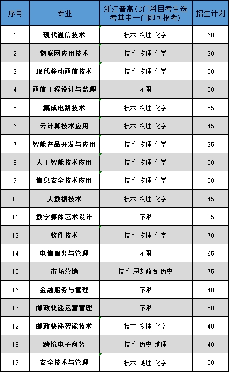 浙江邮电职业技术学院是省内唯一一所邮政、通信类专业为特色的省属公办全日制普通高等职业院校,“省级文明单位”,始建于1958年。学校主校区坐落于历史文化名城绍兴(浙江四大湾区之一绍兴滨海新区),杭州校区为学生综合实训和职工教育培训中心。学校兼具邮政和通信两大行业特有工种职业技能鉴定资质,被誉为浙江通信行业的“黄埔军校”,全国邮政快递人才培养的五朵金花之一。学校占地面积500余亩,校舍建筑面积18.8万平方米,固定资产值2.27亿元,教学仪器设备值4516.88万元,图书38.34万册。共设置20个专业,其中中央财政支持重点建设专业2个,全国职业院校邮政和快递类示范专业点1个,浙江省高职高水平专业群1个,省级优势专业2个,省级特色专业6个。全日制在籍学生6500余名。学校校园风景优美,环境宜人,荣膺“全国部门造林绿化200佳”。学校坚持“以素质为核心,以技能为本位”的办学理念,形成了“学历教育与职业培训互通、校园文化与企业文化共融”的办学特色,成功打造了知行合一的思想教育平台、学练合一的专业教学平台、全面参与的服务管理平台,借助信息化的时代浪潮,用专业彩绘互联网+的现实图景,在邮政通信类专业教育领域形成了独特的品牌优势。学校荣誉