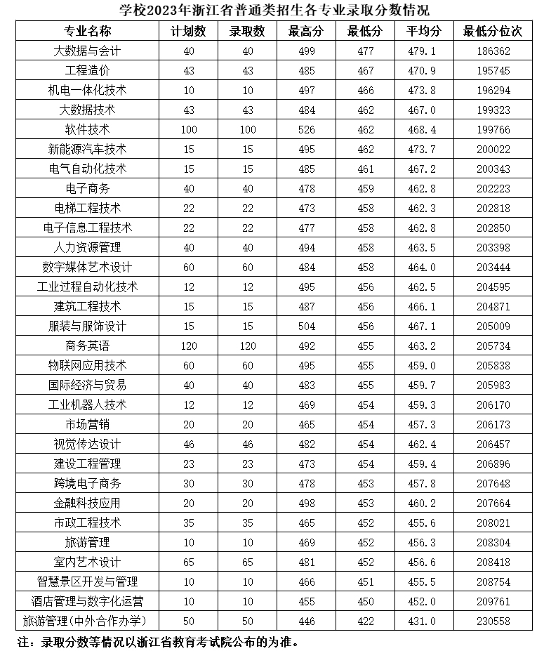 湖州职业技术学院2023年浙江省普通类招生各专业录取分数情况