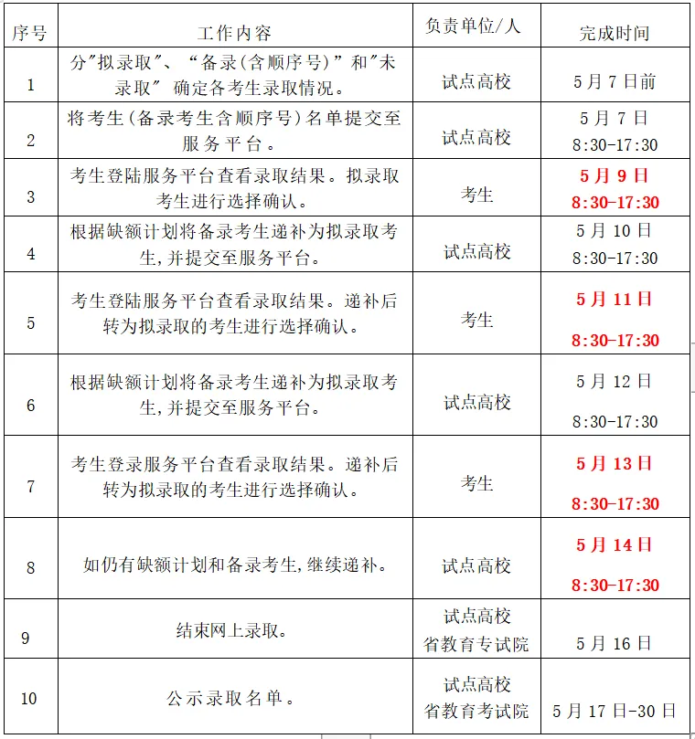首轮拟录取考生在规定时间内登陆浙江省教育考试院服务平台进行选择确认。如有考生放弃拟录取,则缺失名额由备录取考生根据成绩顺序依次转为拟录取。备录考生根据录取进程、待转为拟录取后需登录服务平台确认录取。未在规定时间内确认的,视为自动放弃该次拟录取资格。