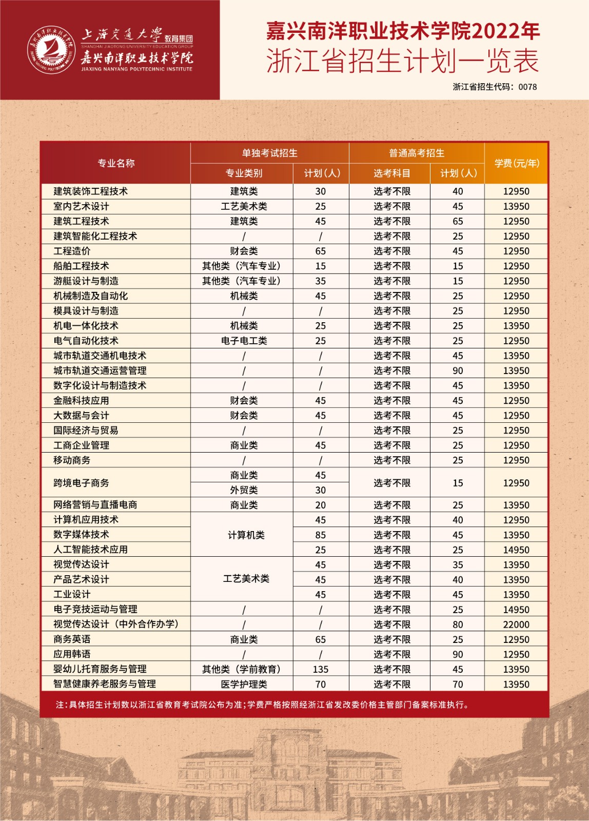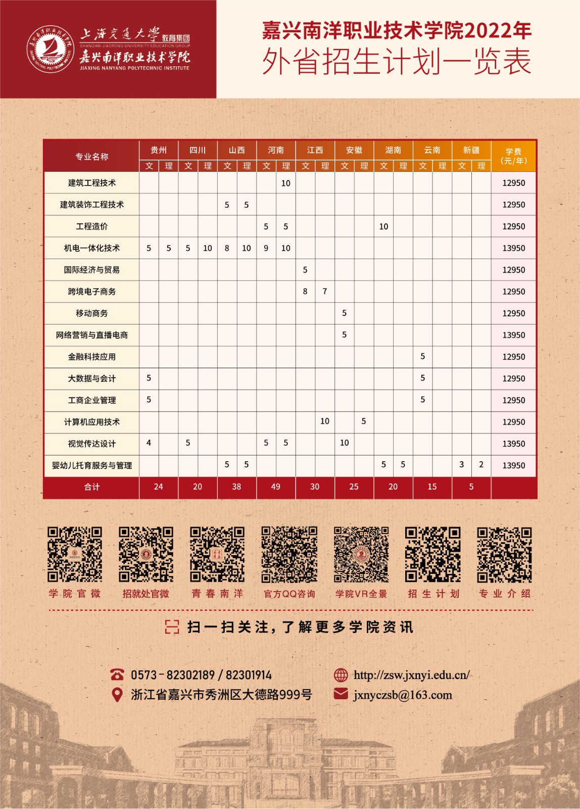 嘉兴南洋职业技术学院2022年招生计划一览表