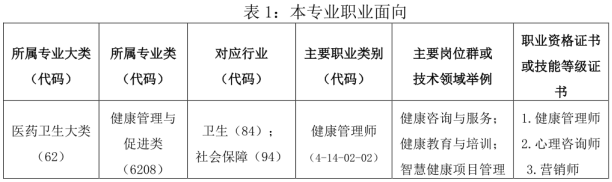 健康管理专业人才培养基于健康管理事业发展实际,根据国内外健康管理岗位需求,培养面向卫生和社会保障行业的健康管理师等职业群,能够在国际化背景下从事个人或群体健康咨询与服务、健康教育与培训和智慧项目管理等工作。本专业人才培养对应的行业、主要职业类别、主要岗位类别、职业资格证书如下表所示: