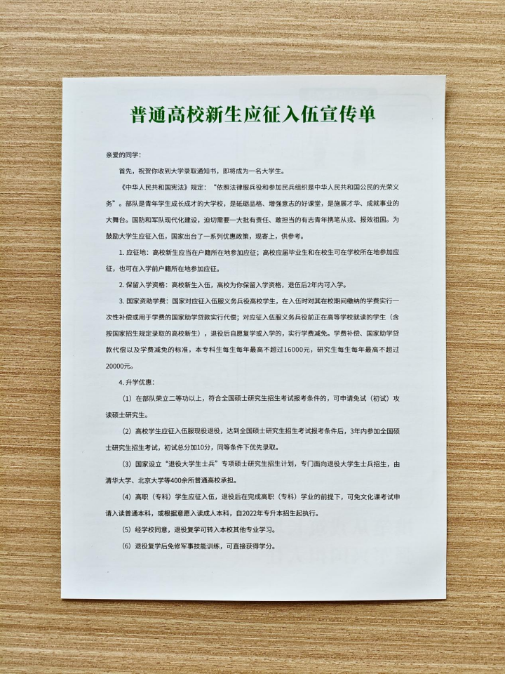 这里详细列出了入学报到的具体步骤、注意事项以及生活安排。请仔细阅读,以确保顺利开启你们的大学生活。❊新生应征入伍宣传单