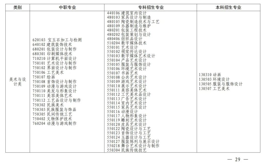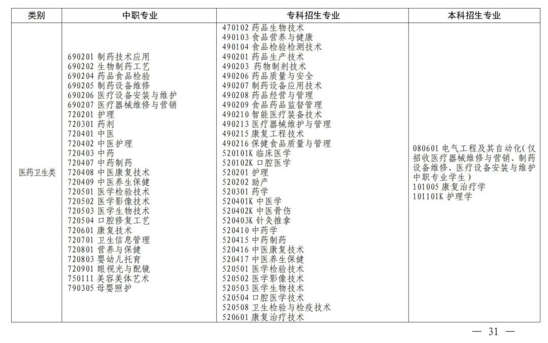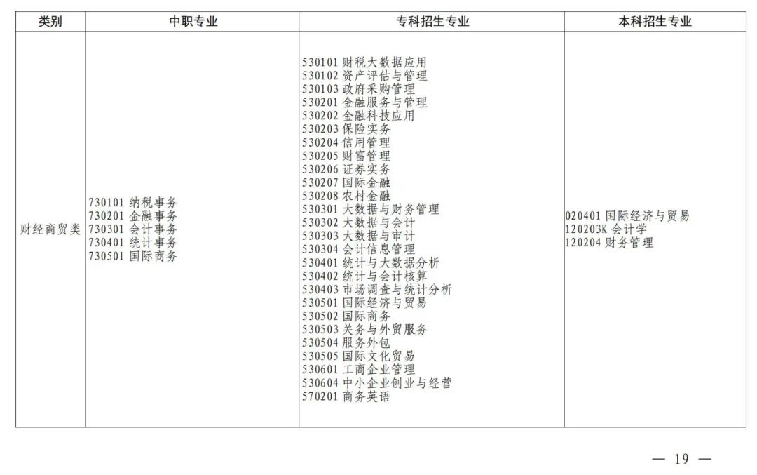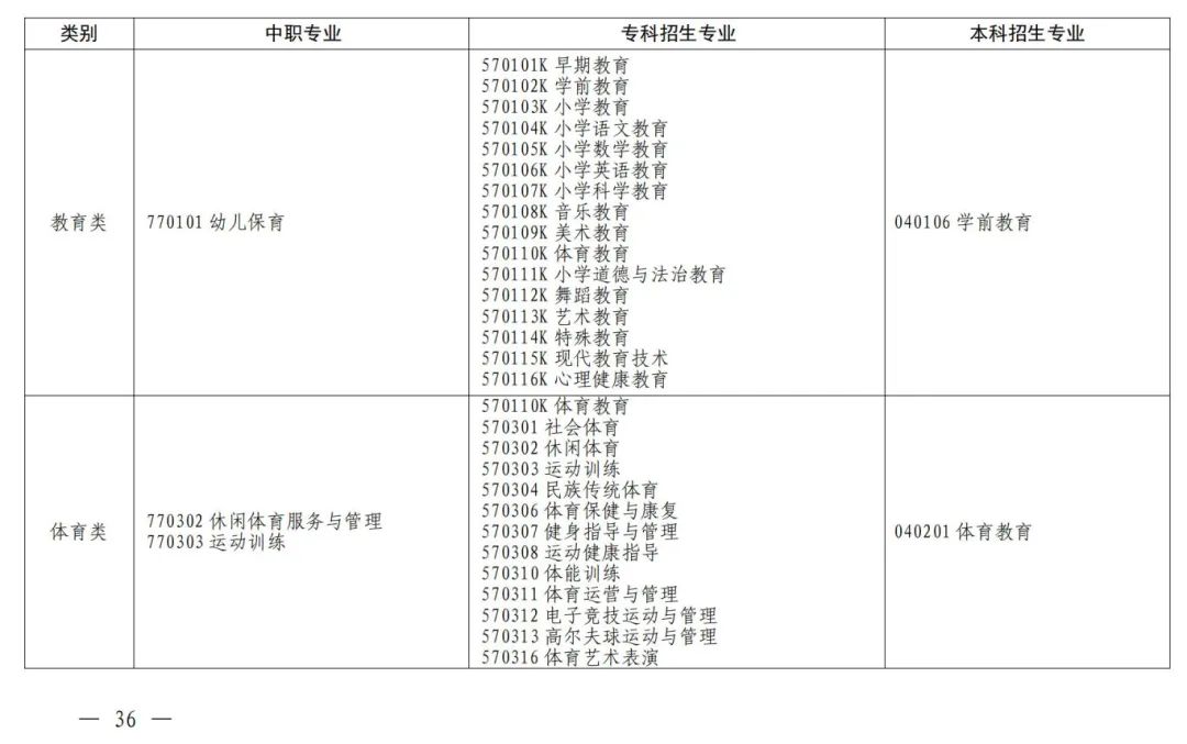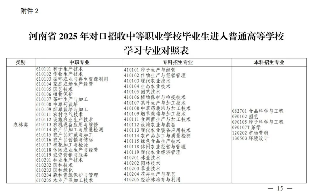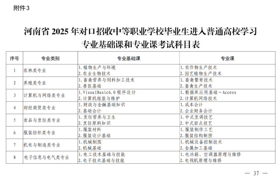 专业基础课和专业课按《2025年河南省对口招收中等职业学校毕业生进入普通高等学校学习专业基础课和专业课考试科目表》(见附件3)规定的专业考试科目统一组织命题。2.体育类专业(1)考试科目和分值。考试科目:公共必修课300分,其中,语文、数学、英语各100分;身体素质270分,其中包括100米跑、立定跳远、原地推铅球,为考生必考项目;继续暂停专项技术考试,该项成绩以满分计入总分。科目总分为750分。(2)考试方式。语文、英语两科合卷,数学单卷,考试方式为笔试;体育专业考试与普通高招体育类专业省统考统一安排,身体素质项目按照我省2025年普通高考体育专业统一考试的要求和标准执行。3.音乐与舞蹈类专业(1)声乐、器乐、戏曲专业考试科目和分值。公共必修课300分,其中,语文、数学、英语各100分;视唱180分;专业主科(声乐、器乐、戏曲任选其一)270分。科目总分为750分。考试方式。语文、英语两科合卷,数学单卷,考试方式为笔试;视唱、专业主科按照普通高考的要求和标准执行,具体由省教育考试院安排。(2)舞蹈专业(分为艺术舞蹈和国际标准舞,考生任选其一):考试科目和分值。公共必修课300分,其中,语文、数学、英语各100分;剧目表演270分,基本功180分,科目总分为750分。考试方式。语文、英语两科合卷,数学单卷,考试方式为笔试;剧目表演、基本功按照普通高考的要求和标准执行,具体由省教育考试院安排。4.美术与设计类专业(1)考试科目和分值。考试科目为:公共必修课300分,其中,语文、数学、英语各100分;素描150分(含速写50分);色彩150分;工艺美术设计150分。科目总分为750分。(2)考试方式。语文、英语两科合卷,数学单卷,考试方式为笔试;素描(含速写)、色彩、工艺美术设计按照普通高考的要求和标准执行,具体由省教育考试院安排。5.教育类专业(1)考试科目和分值。语文(幼师语文教材)100分;数学(幼师数学教材)100分;时事政治和幼儿教育学共100分,两科合卷,时事政治占30%,幼儿教育学占70%。考试科目总分为300分。(2)考试方式。科目考试方式为笔试,具体由省教育考试院安排。(二)录取按照当年考试成绩,分专业类别划定全省最低控制分数线。对口本、专科录取分批进行,拟安排在4月下旬前完成,具体时间由省教育考试院另行通知。按照考生志愿在最低控制线上从高分到低分依次进行投档,由招生学校按照录取规则、专业招生计划,择优录取。拟录取的考生名单经省教育考试院备案后,由招生高校发放录取通知书。考生加分办法参照普通高校招生统一考试的有关政策执行。六、新生入学后的培养和待遇(一)学生报到和管理新生本人持录取通知书、身份证、准考证,按高校规定的时间到校报到、办理入学手续,经注册取得普通高等学校学生学籍,编入高校一年级就读,按照有关规定进行管理。具备编班条件的,应单独编班,集中管理。(二)教学与培养高校要按照《国务院关于印发国家职业教育改革实施方案的通知》的要求,根据中、高级技术技能人才培养目标要求,制订和完善中职与高职、中职与本科分专业衔接培养实施方案,深化教学改革,强化专业实训教学,创新初级技术技能人才与中、高级技术技能人才衔接培养模式。(三)待遇新生入学后,与统一高考同一专业录取的学生享受同等待遇,其学费、住宿费以及学生资助等执行同样的标准。(四)毕业学生在学校规定学习年限内,修完教育教学计划规定内容,成绩合格,达到学校毕业要求的,学校应当准予毕业,并颁发毕业证书。符合学士学位授予条件的,颁发学士学位证书。七、工作要求(一)高度重视,精心组织。各地教育行政部门、招生考试机构要严格落实教育部关于国家教育考试招生工作有关要求,精心组织、周密安排,切实做好招生考试宣传和考试组织管理等工作,严肃考风考纪,确保考试安全。(二)强化责任,服务考生。各中职学校、高校要切实负起责任,为考生提供考试咨询服务。各中职学校要做好诚信考试教育和招生政策解读等,确保考生充分了解对口招生政策。各地招生考试机构、各高校要积极开展网络招生咨询及志愿填报指导活动,为考生提供政策解读和咨询指导服务。各高校要在招生章程中明确本校对口招生的重要事项,及时公布本校对口招生分专业最低录取分数控制线。(三)严厉打击,确保安全。各级教育行政部门、招生考试机构要会同宣传、网信、公安、工信等部门加强对网络谣言、不实信息等有害信息的处置,严防考试舞弊等违规违纪问题发生,严厉打击替考、通讯器材作弊等各种形式的考试舞弊行为,切实维护考试公平公正。对考试招生过程中发生的违规违纪行为,要严肃追责,依法查处,决不姑息。附件:1.河南省2025年对口招收中等职业学校毕业生进入普通高等学校学习招生学校总表2.河南省2025年对口招收中等职业学校毕业生进入普通高等学校学习专业对照表3.河南省2025年对口招收中等职业学校毕业生进入普通高等学校学习专业基础课和专业课考试科目表2024年10月16日