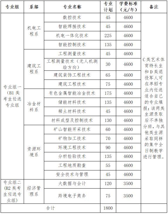 专业志愿填报时,A类、C类、D类考生可在我院单招专业内任选适合自己的专业填报;B1类考生只能在专业组一,即资源环境系、冶金材料系、建筑工程系、机电工程系单招专业内任选适合自己的专业填报;B2类考生只能在专业组二,即经济管理系单招专业内任选适合自己的专业填报。若B类考生兼报了专业组一、专业组二的专业,则以第一专业志愿所在专业组为准,跨专业组专业无效。填报时请注明是否服从专业调剂,录取严格按志愿顺序进行。