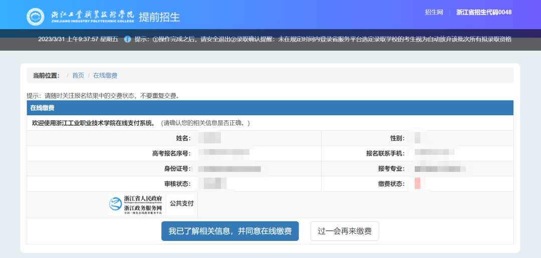 1、入围考生可点击在线缴费,按照提示完成缴费