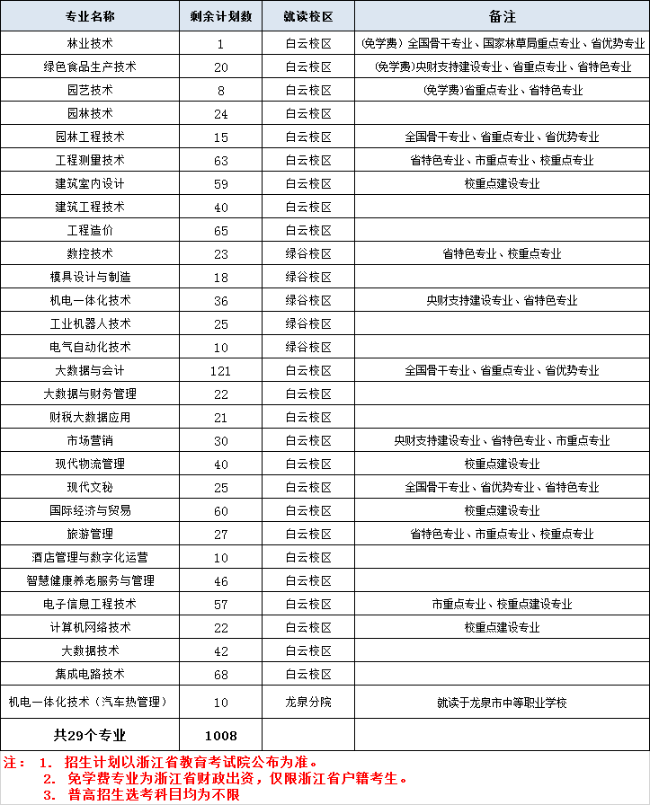 丽水职业技术学院2024年浙江省普高招生普通类剩余计划