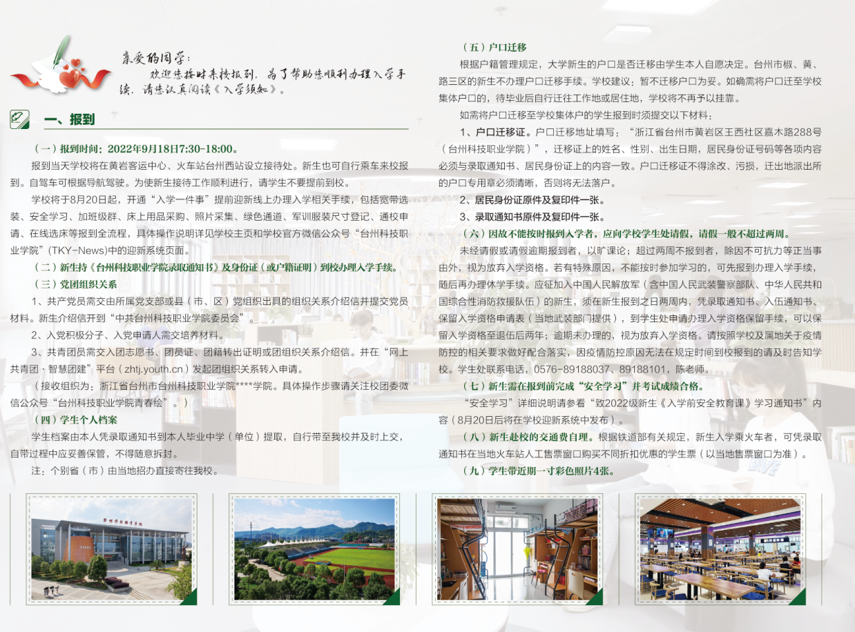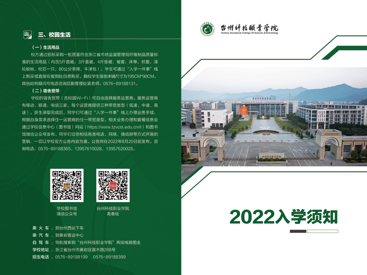 附件为台州科技职业学院《2022入学须知》,请同学们微信搜索“台州科技职业学院”、“台州科技职业学院青春绘”、“台州科技职业学院图书馆”官方微信公众号了解相关最新资讯。