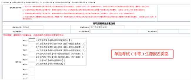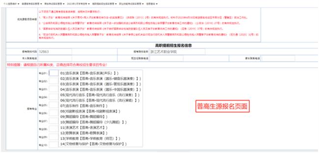 (3)填报专业志愿:每个考生限填报符合报考条件的两个专业,且兼报专业必须为同一专业类别,不可跨类别兼报(报考文物修复与保护和学前教育(师范)专业的考生不能兼报其他专业);若普高招生考生未按生源类别填报,单独考试招生考生未按浙江省职业技能考试对应类别填报,所填志愿无效。音乐类考生必须根据自身特长和所学专业的具体情况,填报相应的专业志愿。