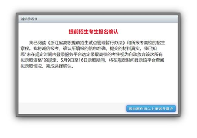 2.登录系统后将会自动弹出诚信承诺书界面,阅读后点击:我自愿作出以上承诺并遵守。