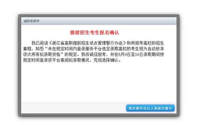 2.登录系统后将会自动弹出诚信承诺书界面,阅读后点击:我自愿作出以上承诺并遵守。