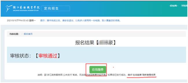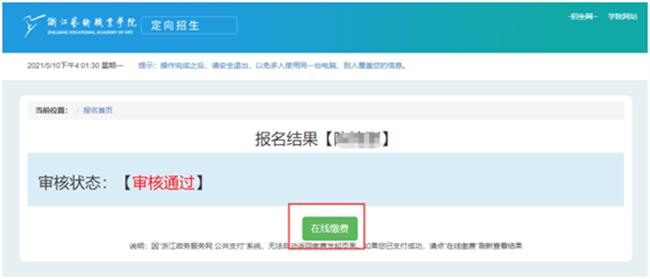 四、回到报名结果查询界面,再次点击在线缴费,进行状态刷新