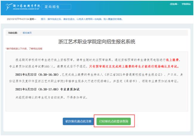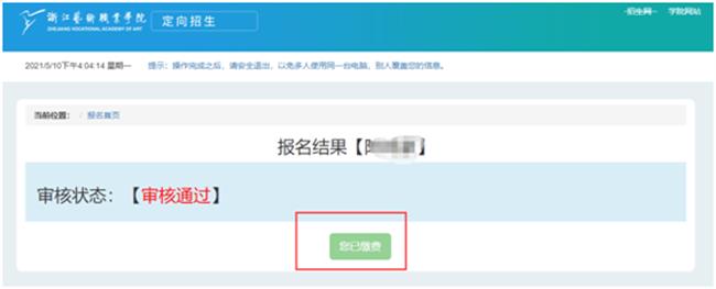 1.网上报名及缴费:2021年5月9日—5月18日考生登录浙江艺术职业学院招生网(https://www2.zj-art.com/zhaosheng)进行网上报名,填写和提交相关信息,上传本人《浙江省2021年普通高校招生考生报名证》、户口本、身份证照片。