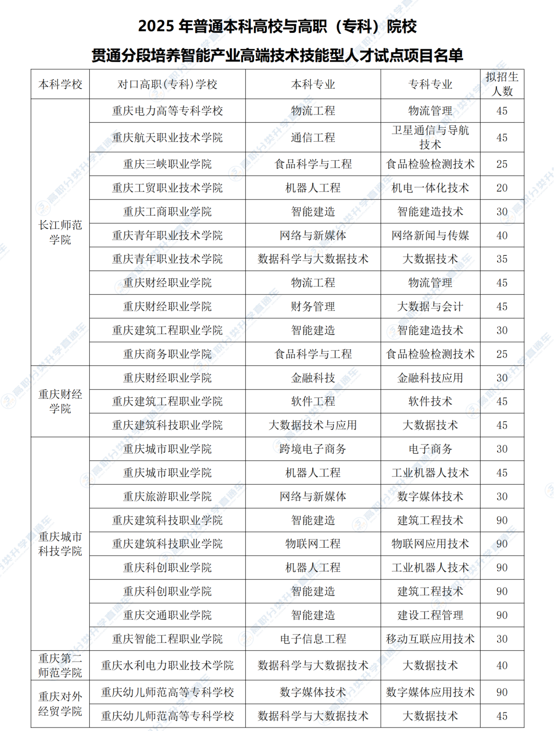 重庆市教育委员会关于公布2025年普通本科高校与高职(专科)院校贯通分段培养智能产业高端技术技能型人才试点项目名单的通知