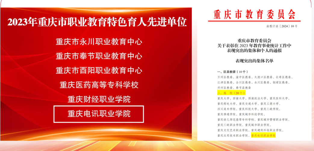 4月26日,重庆市教委召开 2024 年全市职业教育工作会,会上表彰了各类先进集体,我校被评为“重庆市职业教育特色育人先进单位”。