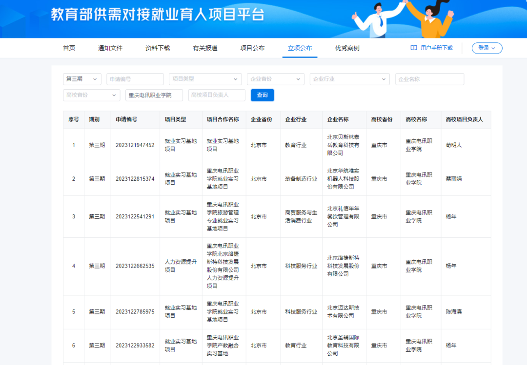 6月14日,教育部公布了第三期供需对接就业育人项目立项名单,我校有47个供需对接就业育人项目获批立项。其中包括就业实习基地项目27项,定向人才培养培训项目12项,人力资源提升项目6项,重点群体就业帮扶项目2项。