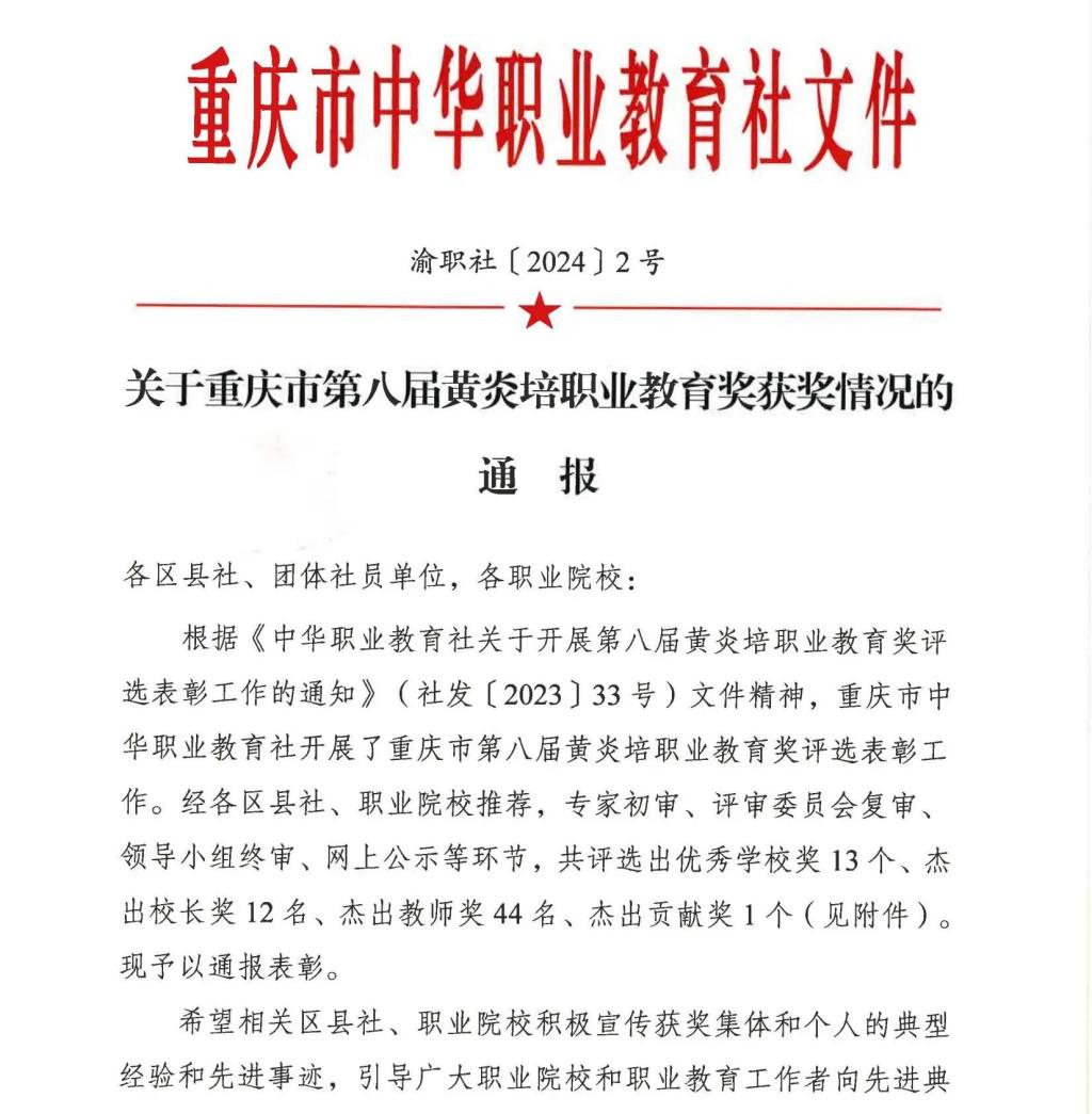 2月,重庆市中华职业教育社公布了重庆市第八届黄炎培职业教育奖获奖名单,我校荣获“优秀学校奖”,学校教师周利梅获评“杰出教师奖”。