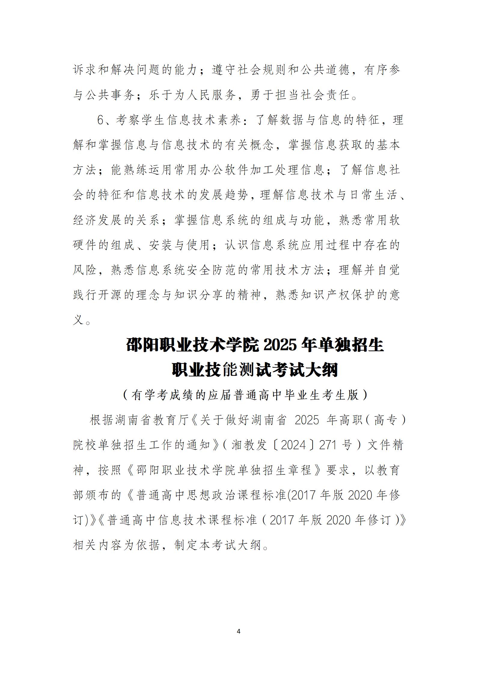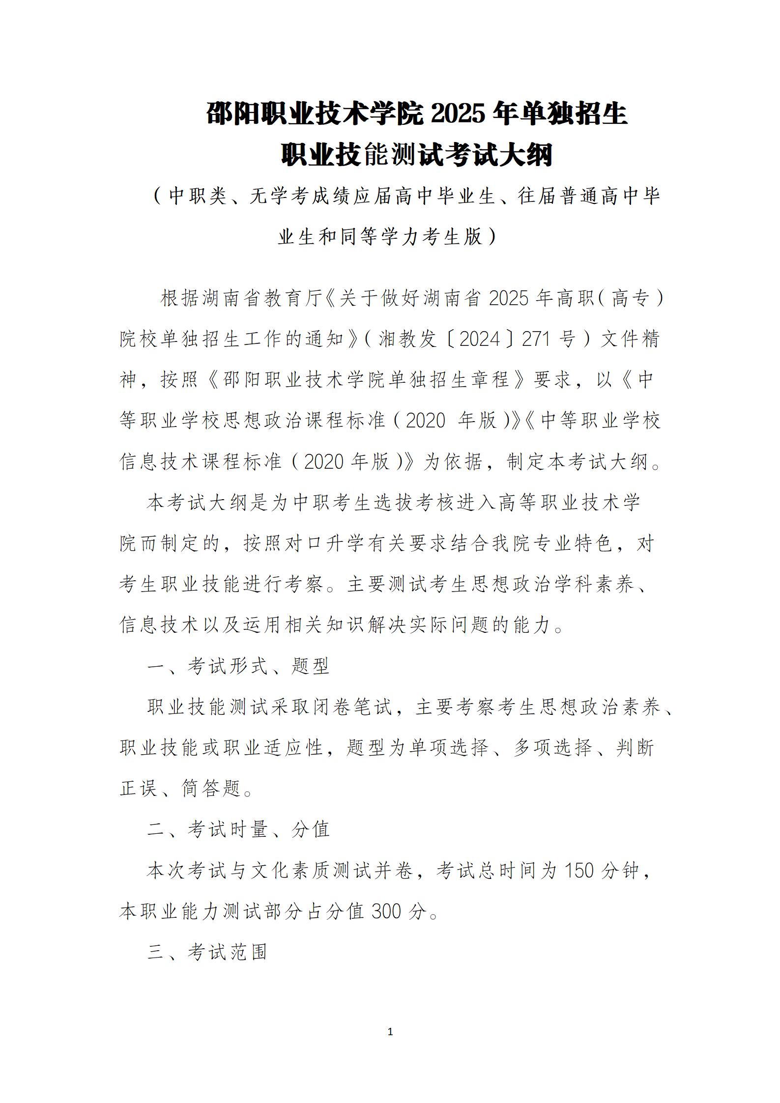 邵阳职业技术学院2025年单独招生职业技能测试考试大纲