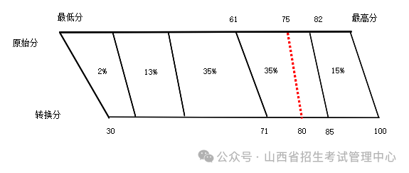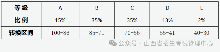 第二步,将A至E五个等级内的考生原始分,按照等比例转换规则,转换到100~86,85~71,70~56,55~41和40~30五个分数区间,根据转换公式计算,四舍五入取整数得到考生的等级转换分。转换后的成绩一分一档,考生排序不变。